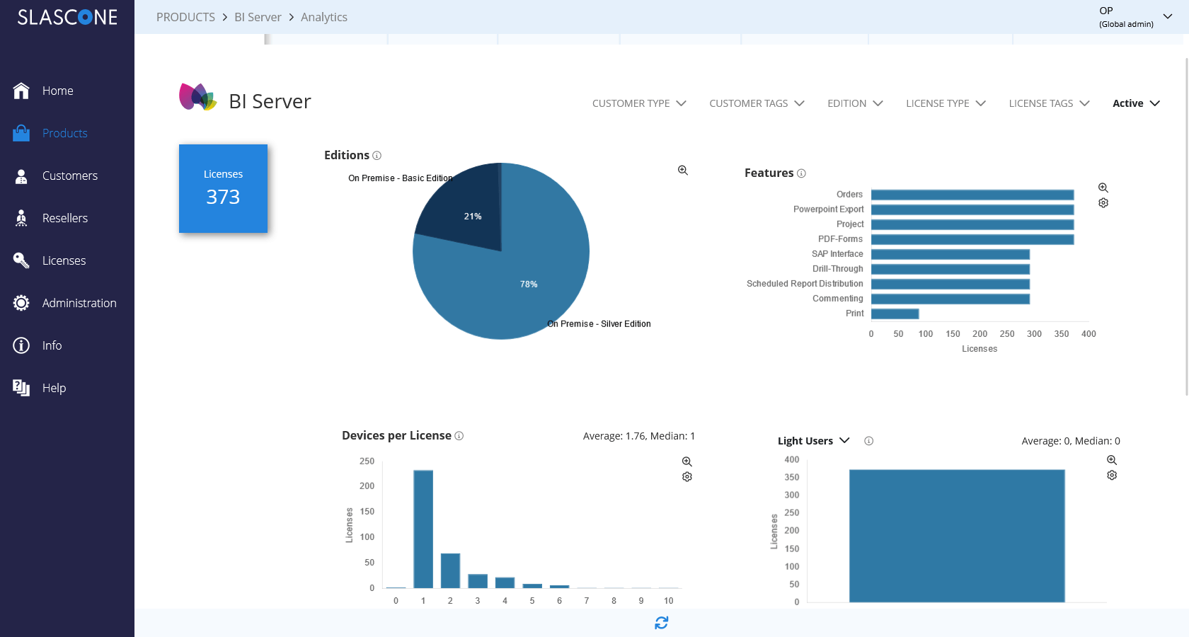 - Product Dashboard: consolidated view of a product’s key metrics, filtered by license properties such as activation status.